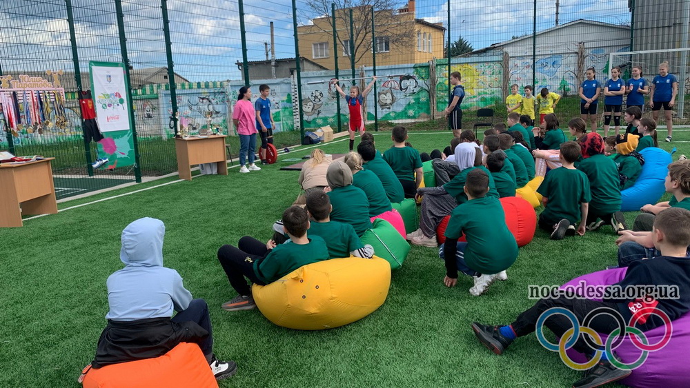 На початку заходу заступник голови відділення НОК України в Одеській області розповів юним школярам, заради чого їх зібрали на майданчику цим яскравим сонячним. Коротенька розповідь про олімпійський рух, і дітям вже дивляться на те, що відбувається, більш зацікавлено.